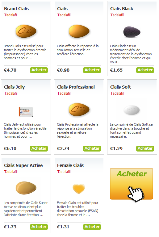 Nous avons une large selection de produits disponibles en stock ED . Vous pouvez acheter Cialis bon marche generiques , la marque Cialis, Cialis Soft Tabs ou Cialis professionnels . Lorsque vous achetez Cialis generique escompte en ligne chez nous, vous pouvez economiser jusqu'a 80 % par rapport a votre pharmacie locale . Cialis generique est le meme medicament en tant que marque , ayant les memes ingredients et les formules chimiques et la chose principale de la meme qualite . La seule difference est le prix, qui est beaucoup plus eleve lorsque vous achetez une marque Cialis .
